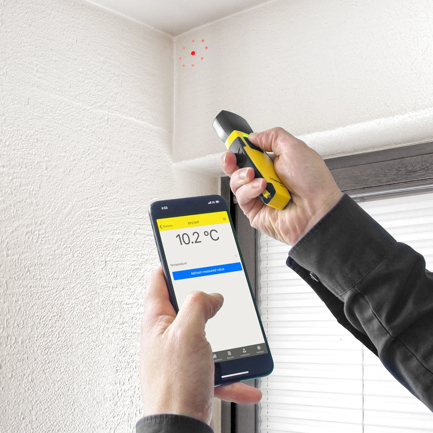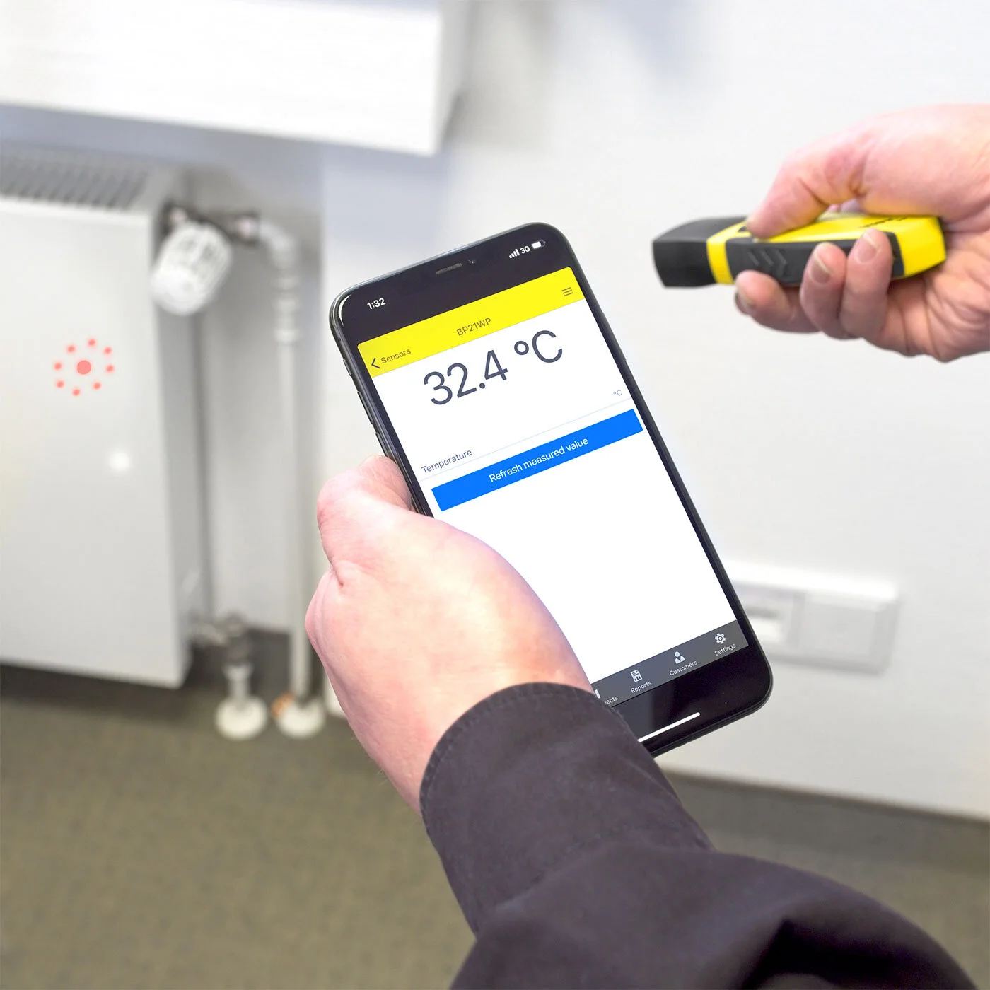 The equipment was designed for a universal range of applications and a convenient measured value determination. In addition to an optical resolution of 10:1 and a temperature measuring range between -30 °C and +250 °C the BP21WP also features a useful multi-point laser which automatically visualizes the size of the measuring spot. The preset degree of emission saves you the trouble of making manual adjustments and covers a wide variety of materials. The measuring device BP21WP is immediately ready for use, it can be connected to the app without the slightest effort and then displays all the measured values on the mobile terminal device.